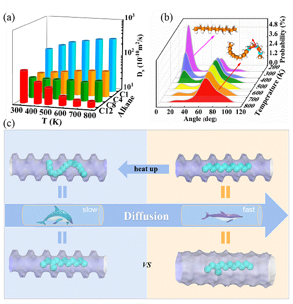 (a)     烷烃分子扩散系数随温度变化图,(b)长链烷烃弯曲角度随温度变化图,(c“热阻效应原理图