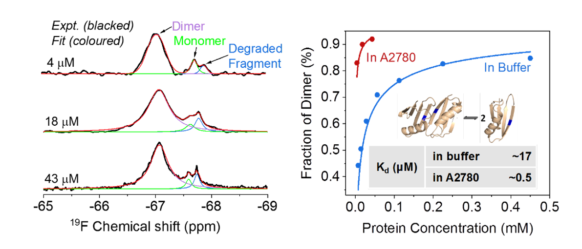 除了较高的灵敏度,wPSP-6F探针同时具有较好的蛋白质构象分辨能力。以GB1突变体的二聚作用为例,19F信号可以在稀溶液或细胞内很好地区分其单体和二聚构象。实验结果表明细胞拥挤复杂的环境会极大地促进蛋白的二聚,其二聚解离常数减小30倍,其中细胞内非特异弱相互作用非常关键。