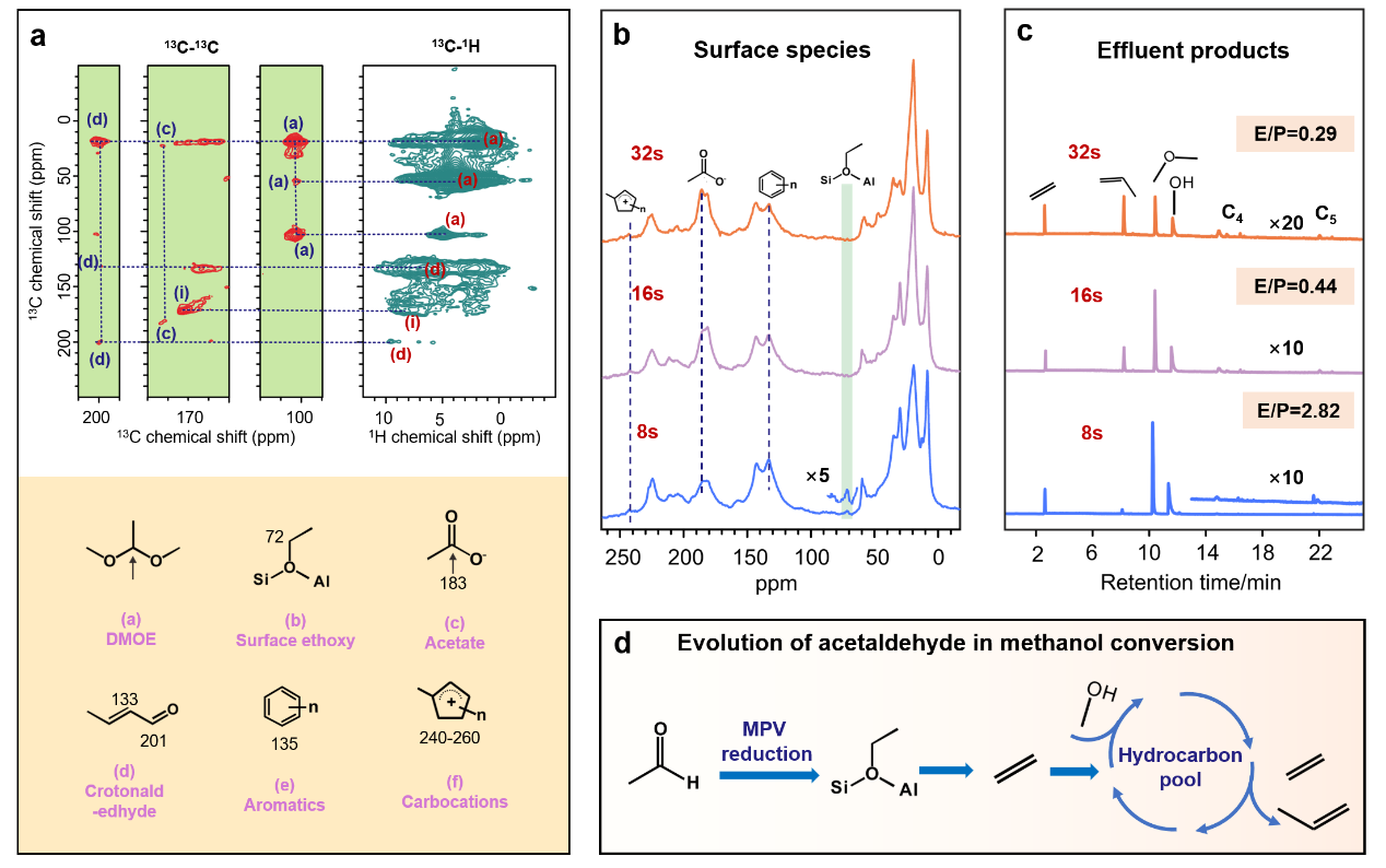 ZSM-5分子筛上乙醛和甲醇共反应表面吸附物种的二维13C-13C以及13C-{1H}相关固体NMR谱(a);ZSM-5分子筛上乙醛和甲醇共反应不同时间表面吸附物种的原位13C固体NMR图谱(b)以及流出产物的色谱分析图谱(c);乙醛与甲醇MPV反应机制以及与“烃池”的生成关系(d
