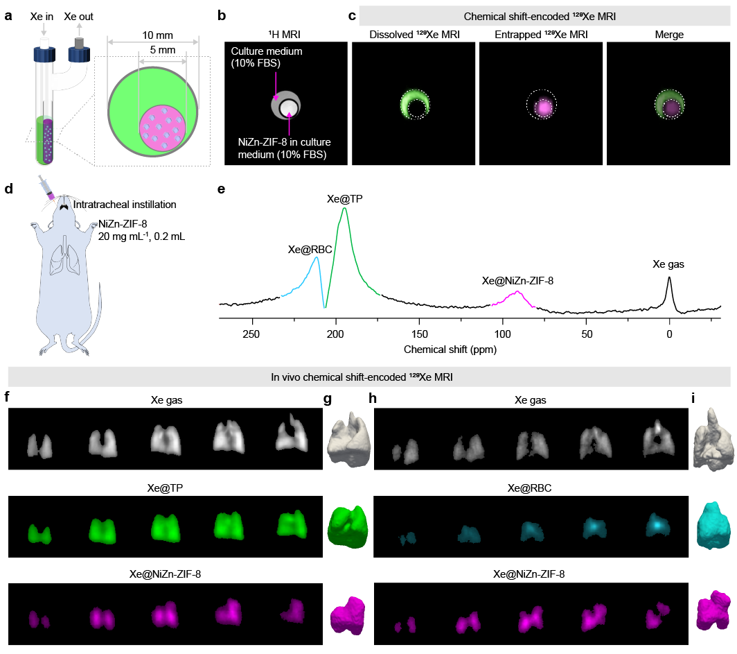 在活体中可明确编码气态129Xe@gas、组织溶解态129Xe@TP、血红蛋白结合态129Xe@RBC以及笼内129Xe@ NiZn-ZIF-8,实现大鼠肺部活体“彩色”MRI